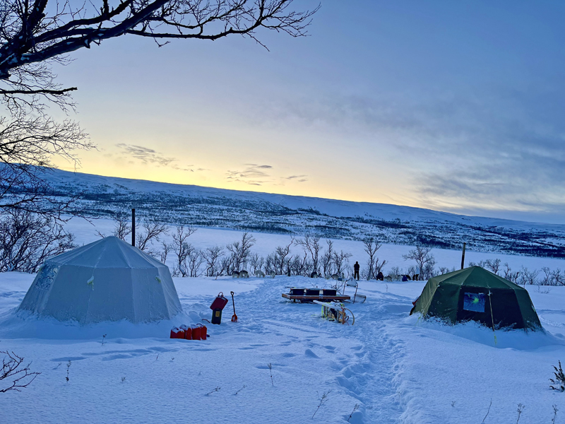 The intention is to spend the 2 nights of the tour in a "Gamme", a heated dome tent. The snowmobile which supports the tour will set up the Gamme in advance at each overnight location and prepare camp for you so that it's warm and cosy when you arrive!