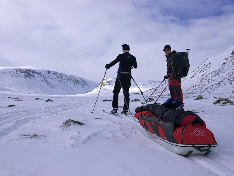 On the tour, the group will carry equipment using a combination of backpacks (typical weight around 10-15kg, mostly for personal items) and "pulks" (sleds, especially for the heavier items such as tents and provisions, typical weight around 35kg). Exact arrangements will differ depending on group size and composition, but you will typically use one backpack per two persons, and alternate between skiing with pack and skiing with pulk.