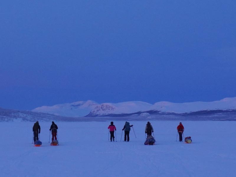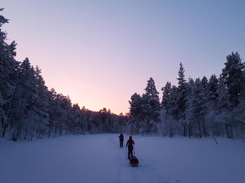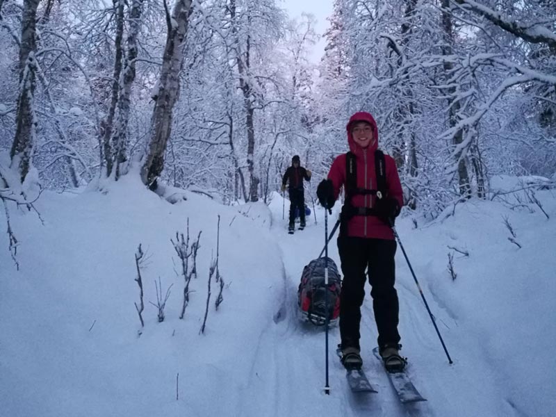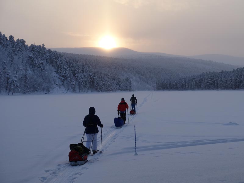 You will be skiing with a pack and/or pulling a pulk (shared with other participants). For the Lemmenjoki tour, skiing is not on prepared tracks, and for Halti will normally be on a mix of snowmobile tracks (when available) and off-trail.