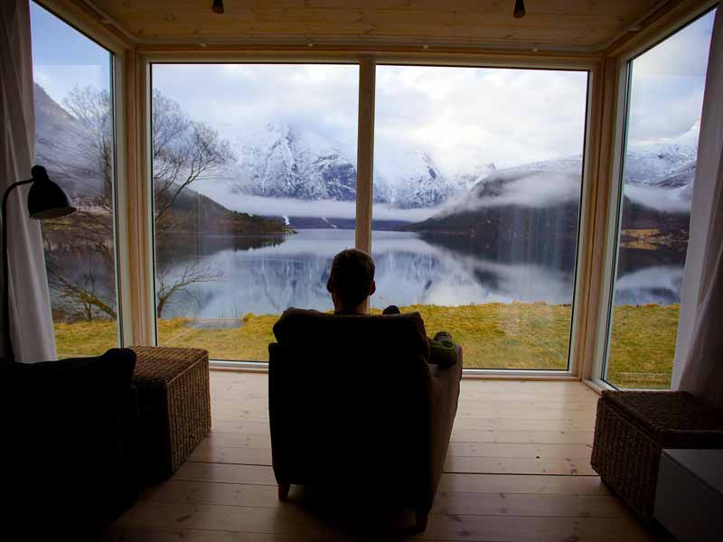 Accommodation is in modern Scandinavian-style cabins right on the shore of Lake Eikesdalsvattnet or Eresfjord, with comfortable rooms and common area to relax in and reflect on what you've achieved on the mountain while you take in the views.