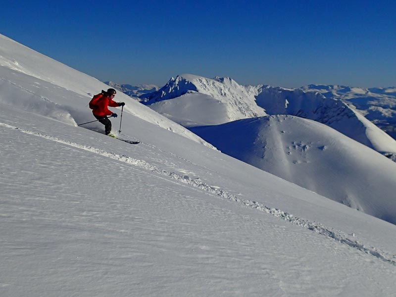 Thousand-metre peaks descend right to the fjord, with slopes of almost any angle, offering a choice of ski touring terrain that is both ideal for the novice and challenging for the expert.