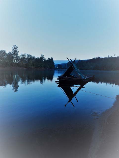 In the early evening we reached our end point and now needed to land the raft in the area of the log trap. The log trap is a construction that gathers the logs together once you have separated them from each other. Forestry machines then lift the logs out of the river and transport them back up the river to the building site to become new rafts!