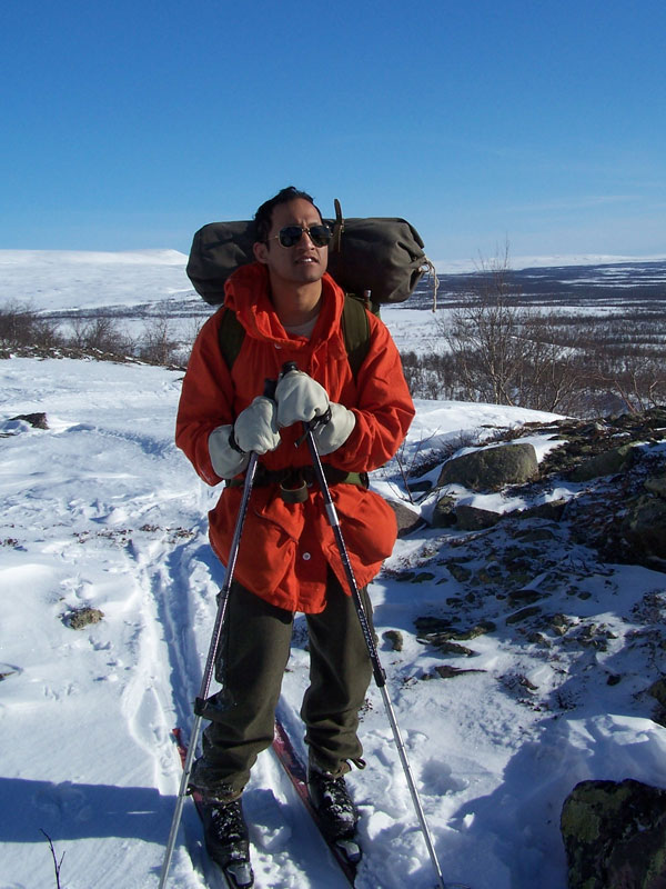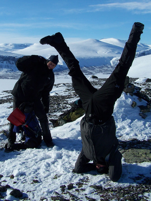As we came over the rise, the world opened into a truly breathtaking panorama, with the mighty mountains of Sarek National Park to our west and the limitless forested lowlands stretching away to the east. With not a breath of wind and a cloudless sky, I felt literally on top of the world. We may have only been three hours from the comforting warmth of the cabin, but there was a real expedition feeling to this day. Philip celebrated by demonstrating his yoga skills with a flawless headstand!