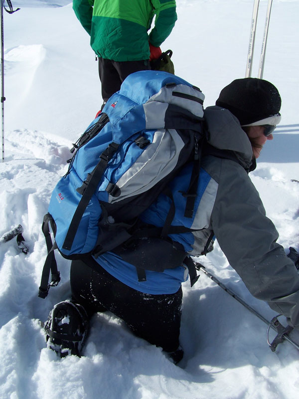 The next day, with the sun shining and a light wind blowing, we headed out across the lake to practise our “on-the-flat” skills and up the hill to try our climbing skins, for our first long-distance mountain view and for instruction in how to use the safety equipment that we would be carrying for the tour.