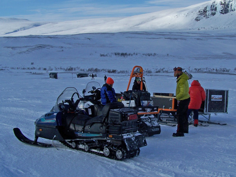Being an introductory tour, this leg is normally done by snowmobile transfer, with the option for hardy types to choose to ski the last half or so of the route. The sun shining and a cold wind was biting at our cheeks as we sped out above the treeline and into the stunning expanse of the “kallfjäll”. Eager to be moving under our own steam, after about 9km we hopped enthusiastically out of the trailer, shouldered our packs and equipment and watched as the snowmobile disappeared over the peak and out of view.