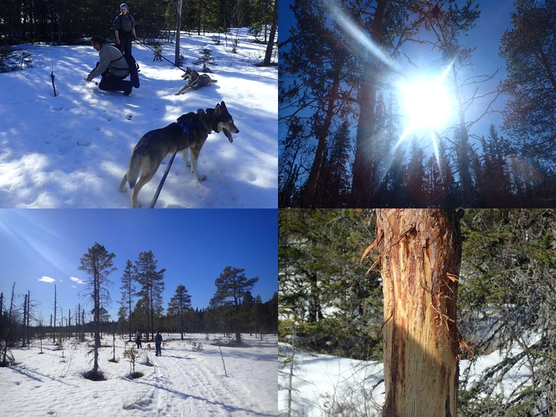 It was just beautiful snowshoeing through the woods, each with our hip harness with husky attached, and it was surprisingly warm – good thing I put on the sun cream. As we emerged onto the wide expanse of the lake, which would still be frozen for a few weeks yet, it was a bizarre feeling to be walking on ice with the hot spring sun beating down on us from above. I’d swap a crowded summer beach for this combination any day!