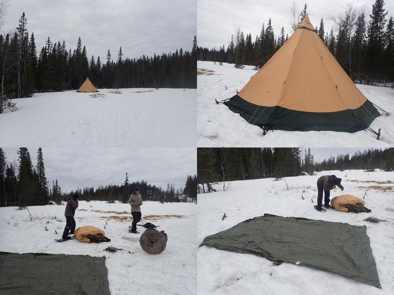 After lunch around the campfire at the kennels, we went by snowshoes to the area where the tipi had been set up most recently (the location is flexible and the tent can easily be moved between tours) to take down the tent and bring it back to be dried and cleaned.