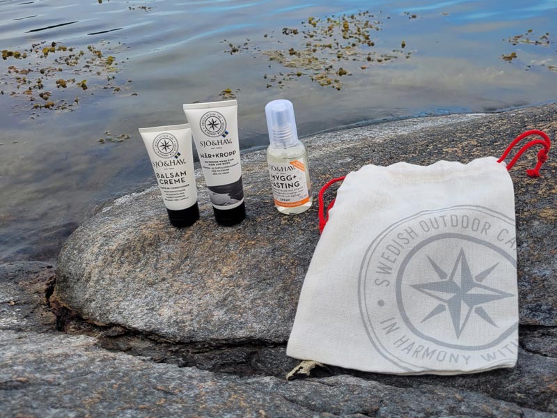 We awoke to a clear, warm morning, and a perfect opportunity to try out the “outdoor spa kit” that is included with the Full Service package option, which contains (at the time of writing – contents may vary) environmentally friendly shower gel/shampoo, conditioner and mosquito repellent from local Swedish manufacturer Sjö & Hav.