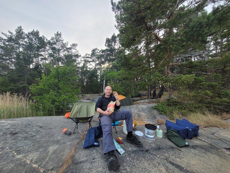 And so began our first lazy, lovely evening of wild camping in the archipelago. We pitched the tent and set about exploring the provisions.