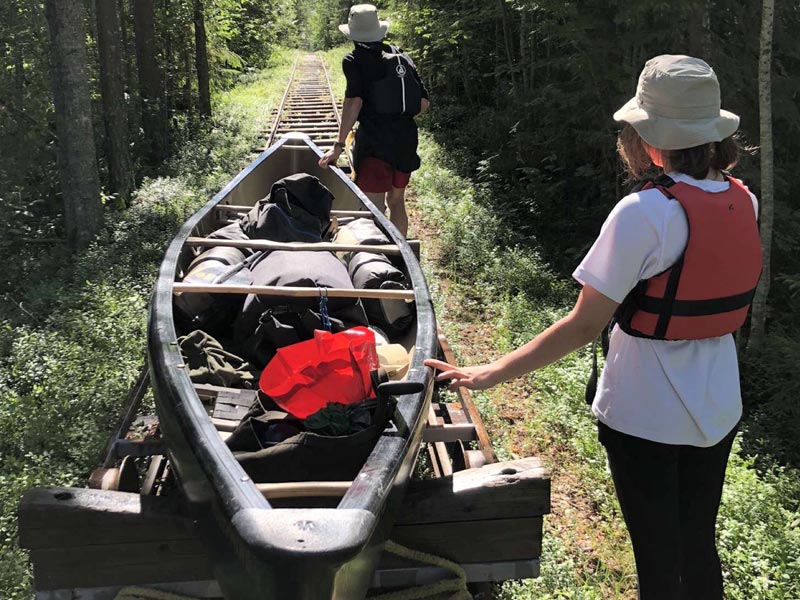 A number of land transports are required, but a very special feature of this tour is that there are "tracks" at many of the transport sites, where the canoe can be lifted onto rails, making the land transports much easier.