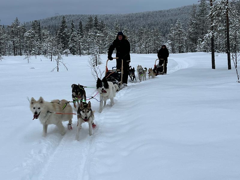- All necessary equipment during dog sledding tour including sleds with own dogsled team. Each participant drives their own sled, usually with 5-6 dogs per team.