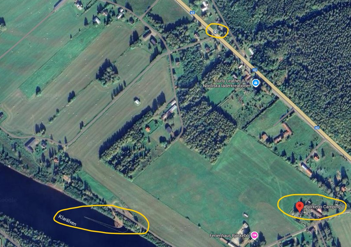 The map below shows the end point for the timber raft tour, Björkebo Camping, and the Södra Gravol bus stop: