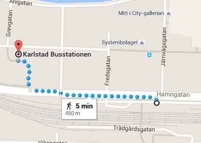 Karlstad bus station is approx. 5 mins' walk from the train station, about 450m. Please see map below (the "Mitt i City Gallerian" shown is a shopping centre with supermarket):